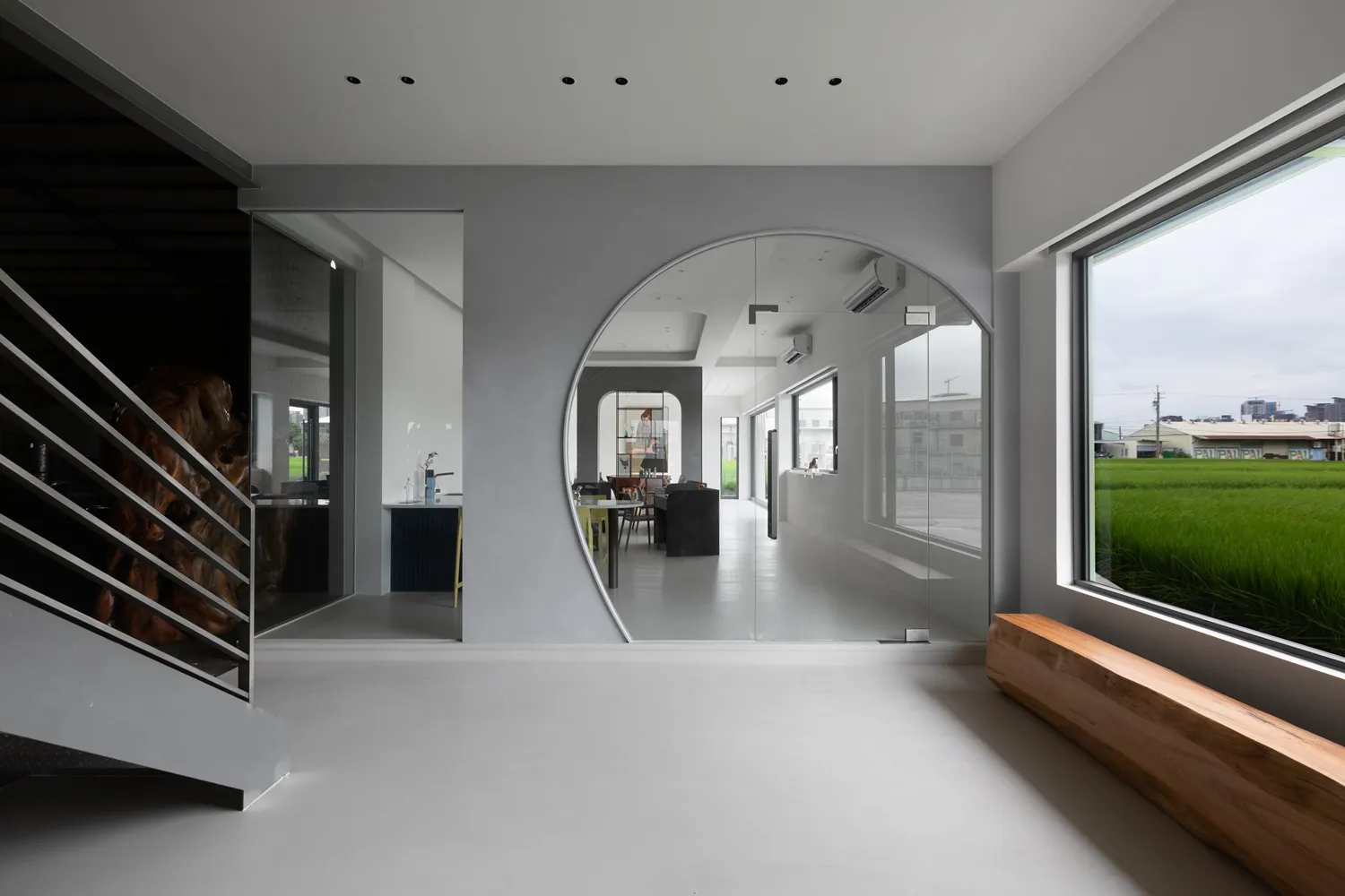 整體以白、灰、黑等中性色為基底,在細節處調和寶藍、亮黃等色彩局部點綴,充滿驚喜的色彩跳脫卻不搶眼,而圓弧玻璃門更是進門的視覺亮點,讓動線自然流動。